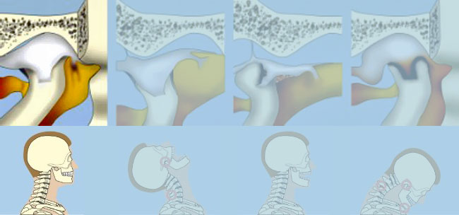 Beim Aufprall kommt es zu einem Zurückreißen des Kopfes. Dadurch dass der Unterkiefer am Rumpf durch die infrahyoiale Muskulatur befestigt ist, gibt es ein Beschleunigungsproblem. Der Kopf hat eine andere Beschleunigung als der Rumpf. Dadurch kommt es zu einem Herausreißen des Unterkiefers beim Zurückschleudern des Kopfes und einer Stauchung im Kiefergelenk beim Nachvornepeitschen des Kopfes. Meist bleibt ein stark verletztes Kiefergelenk zurück, das in der Unfallerstversorgung selten Beachtung findet.